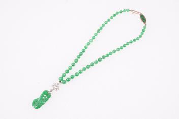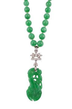 An Art Deco jadeite and diamond necklace, first half 20th century composite, composed of jadeite beads measuring approximately 5.9mm diameter, suspending an openwork jadeite pendant carved as a fruiting vine from a geometric diamond surmount, to a gold clasp set with two pear-shaped jadeite cabochons, length 38.5cm, pendant approximately 5.5cm, combined gross weight approximately 30 grams,