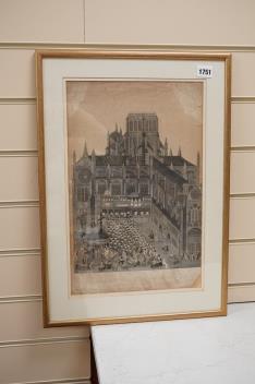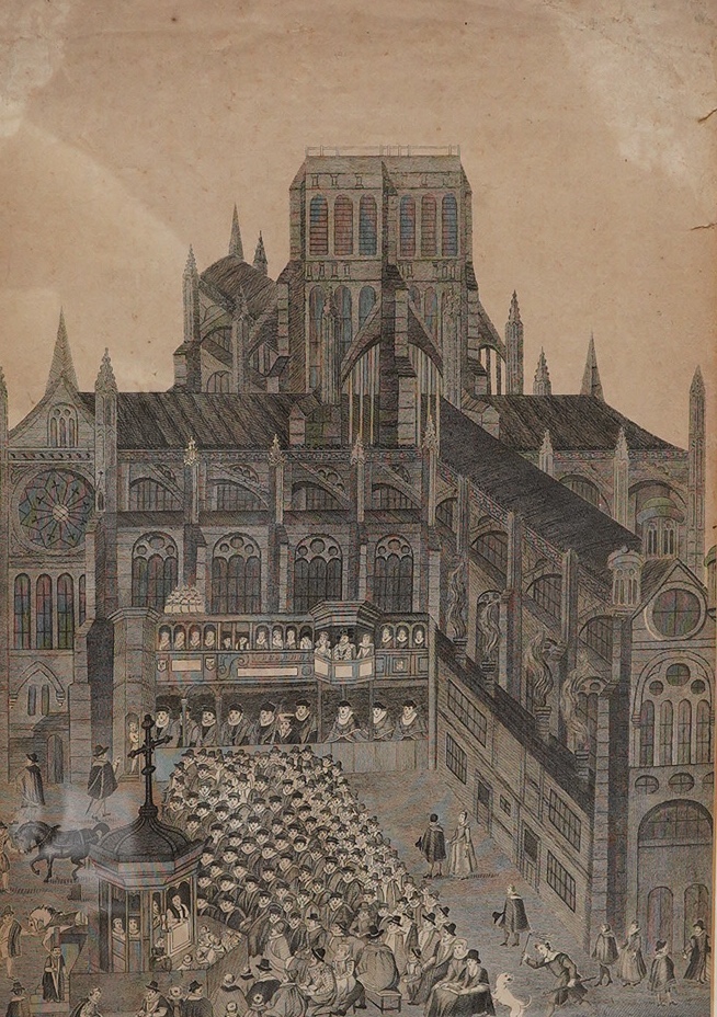 Lot 1751 , 17th century, ‘St Paul’s Cross’, inscribed in pencil to the margin and dated 1620, engraving, visible sheet 41 x 26cm