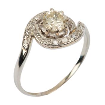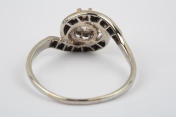 A diamond ring, claw-set with a brilliant-cut diamond weighing 0.75 carats, within a border of swirled design set with brilliant-cut diamonds totalling approximately 0.20 carats, size R, gross weight approximately 3 grams