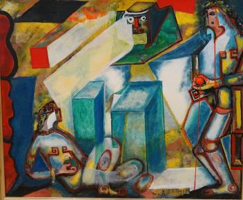 V. Sibello, ‘Adam and Eve’, signed, cubist oil on board, 64 x 76cm
