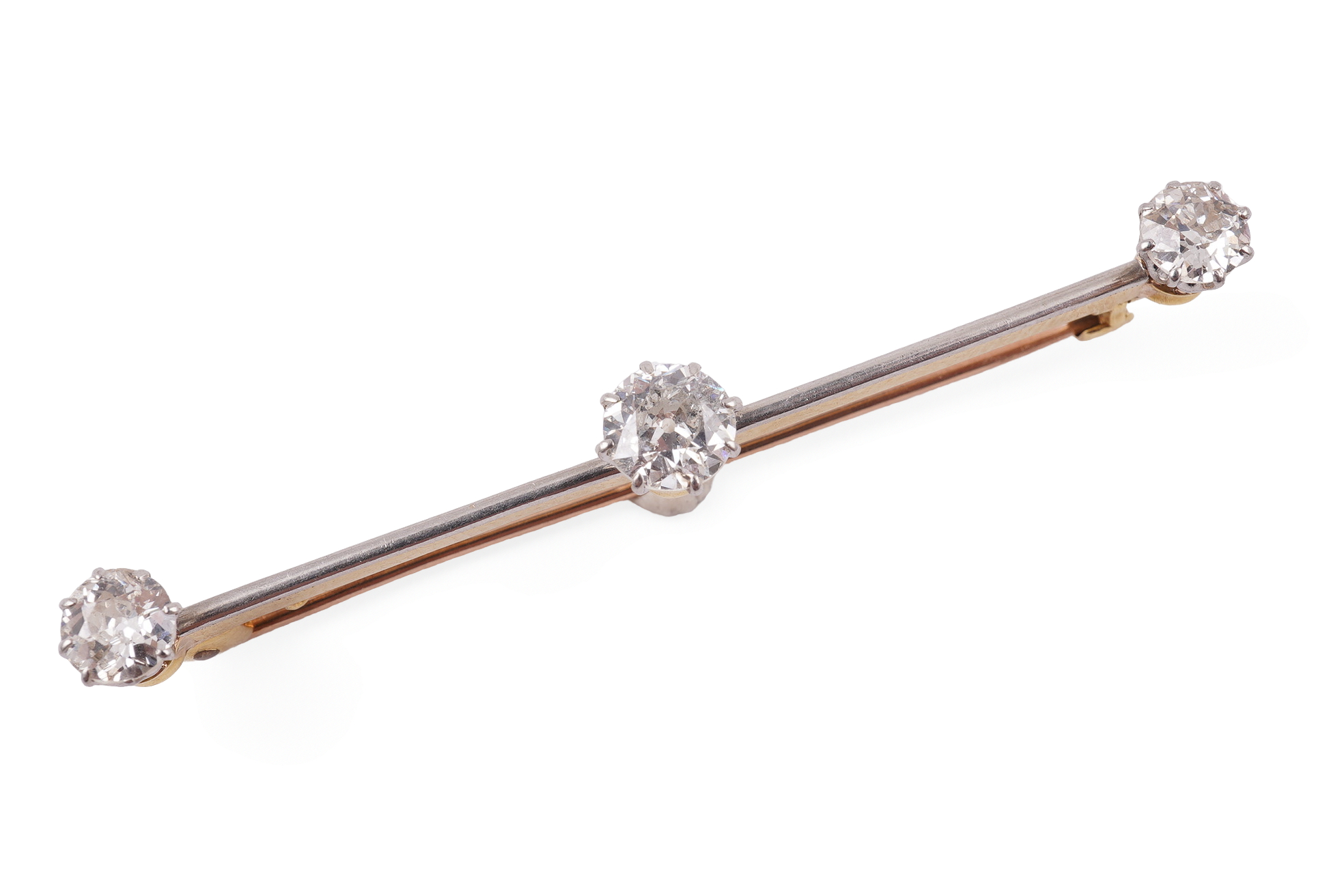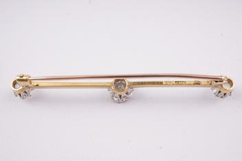 A diamond bar brooch, early 20th century, claw-set with three circular-cut diamonds totalling approximately 1.40 carats, mounted in gold, length 5.5cm, indistinctly marked, gross weight approximately 3.6 grams