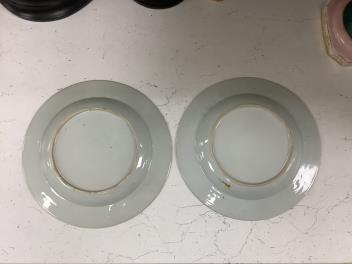 One plate with five small shallow chips to rim, the other with two small shallow chips; both with minor surface wear.