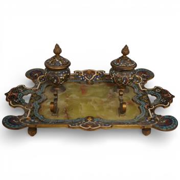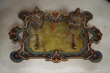 Lot 1105 , A late 19th century French champlevé enamel and onyx deskstand, 18 x 28cm.