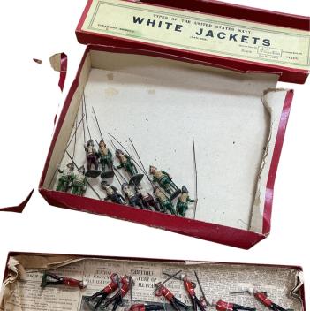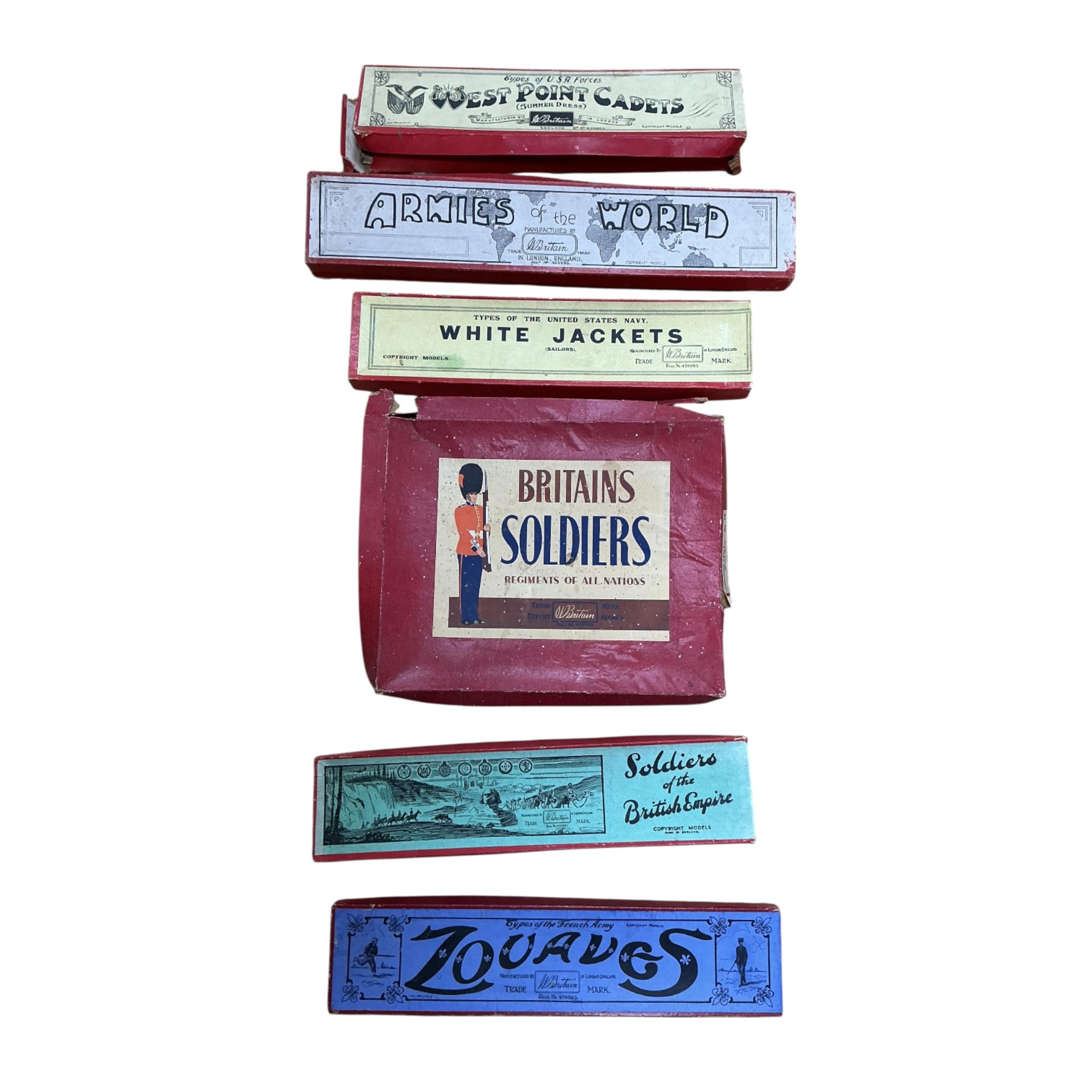 Britains lead soldiers; a boxed set of ‘Types of the French Army’; Zouaves (No.142), comprising eight riflemen running, a boxed ‘Soldiers of the British Empire’; Princess Patricia’s Canadian Light Infantry (No.1633), comprising eight riflemen marching, a boxed ‘Types of the US Navy’; White Jackets (No.1253), comprising five riflemen marching, a ‘Types of USA Forces’; Wedt Point Cadets (No.299), comprising 16 riflemen marching, together with twelve unboxed Company of Archers (from No.2079), eleven unboxed pikemen by an unknown maker, plus two empty boxes; Armies of the World; The Horse Guards (No.1343) and a ROAN; Landing Party with Gun (No.79), boxes and soldiers generally a.f.