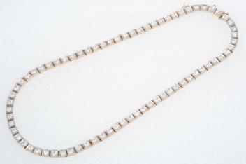 Beautiful and very wearable necklace in good condition, diamonds bright and lively, approximately H-J colour, VS-SI clarity on average, well-matched. Very well made and nicely articulated, sitting well on the neck. Minor kinks when laid straight but vanish when worn. Minor damage to end of clasp at reverse, but still holding secure.
