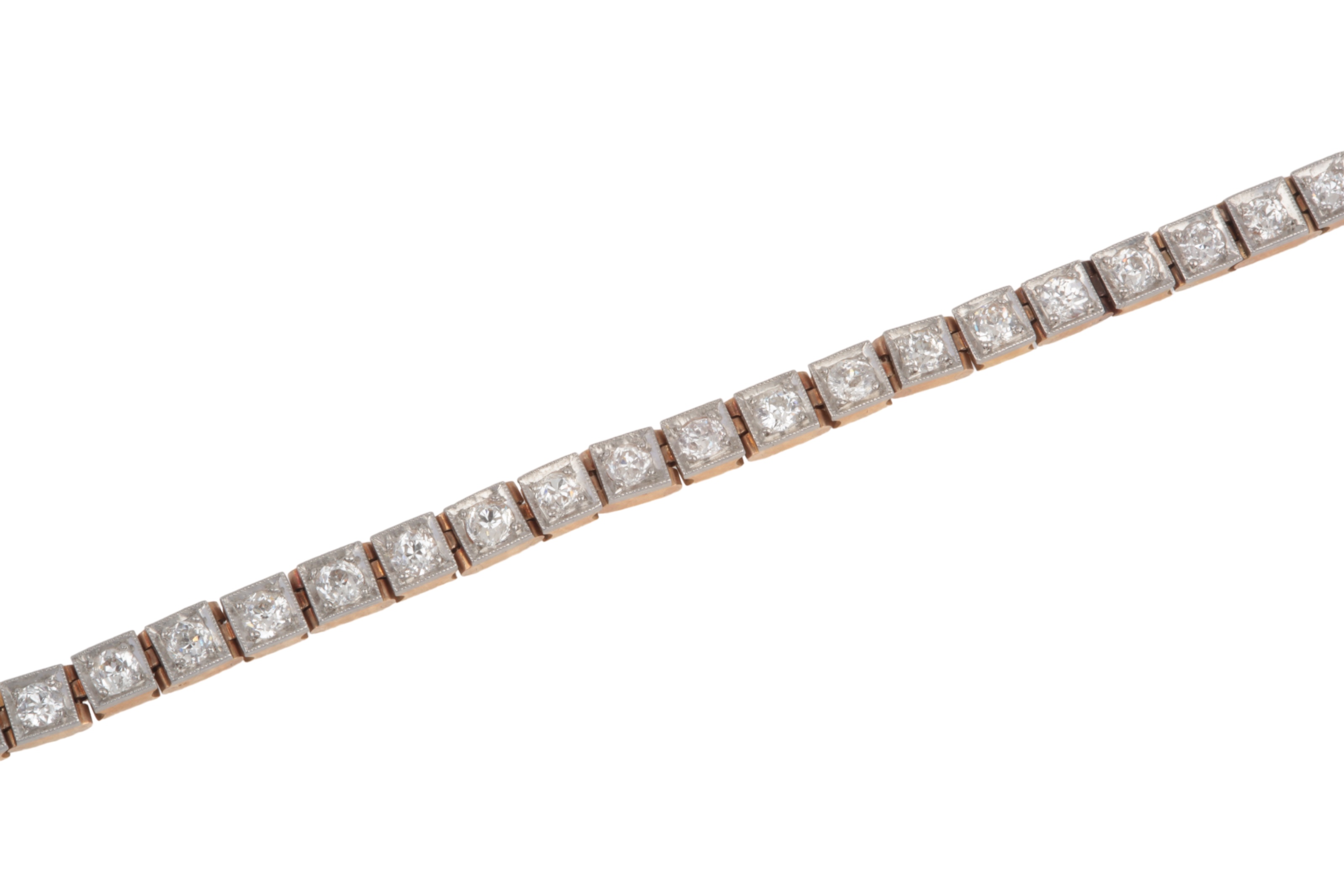 An attractive diamond rivière necklace, early 20th century, composed of square links with millegrain borders, set with circular-cut diamonds totalling approximately 7.00 carats, mounted in gold and platinum, length 38cm, gross weight approximately 38 grams