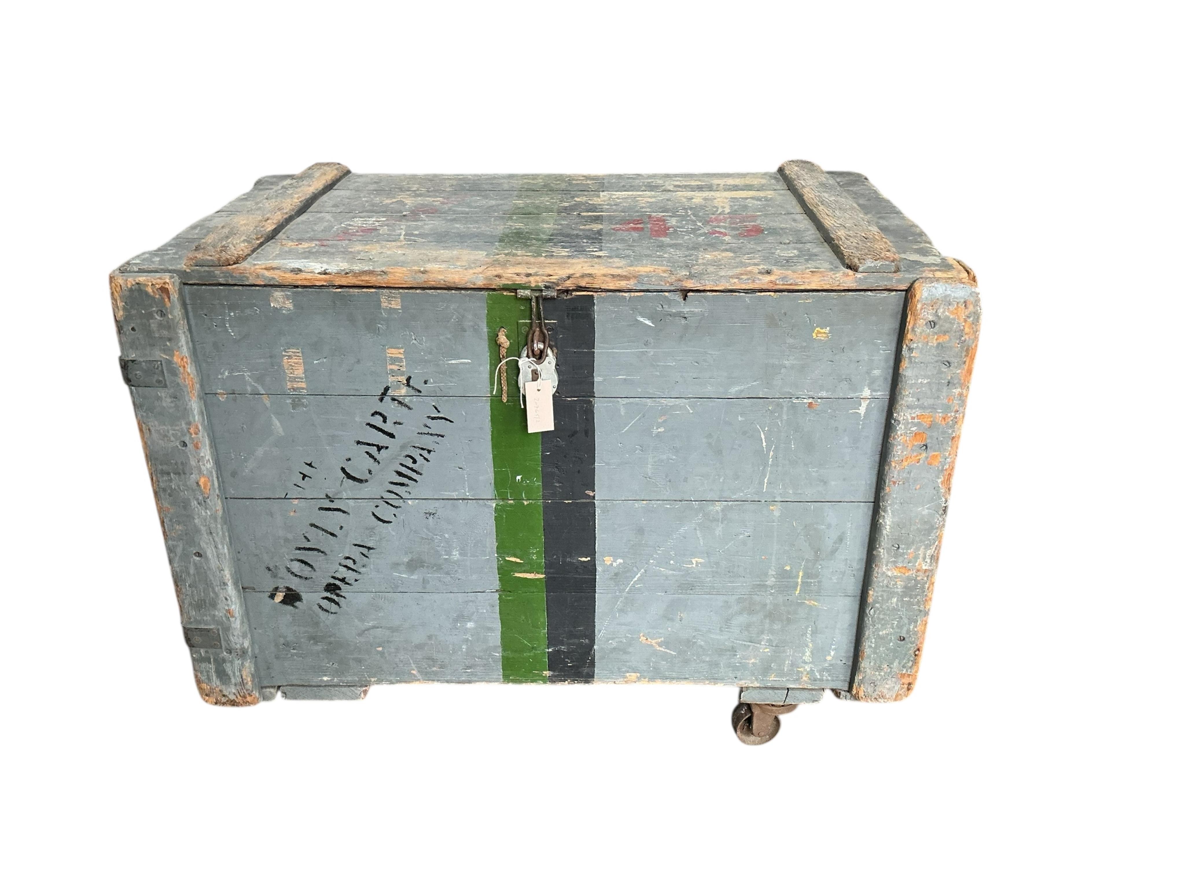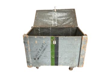 A trunk on wheels bearing the D’oyly carte opera company stamp, from a production of Princess Ida, width 112cm, depth 68cm, height 84cm
