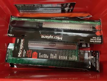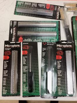 Lot 1076 , Fourteen unused Microplanes and rasps, all still in the original packaging, some packaging damaged and open, including two Japanese Shinto Saw-rasps