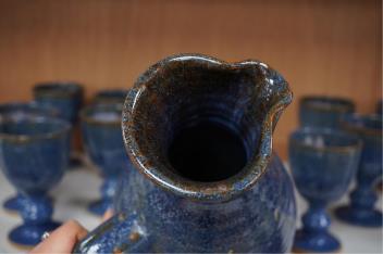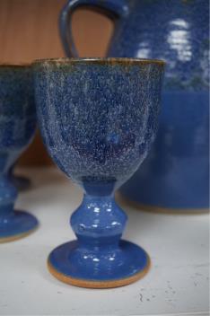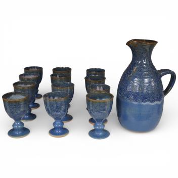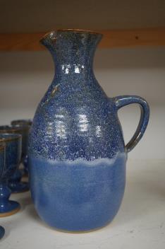 A Canterbury pottery, blue glaze jug and twelve goblets, jug 28cm high
