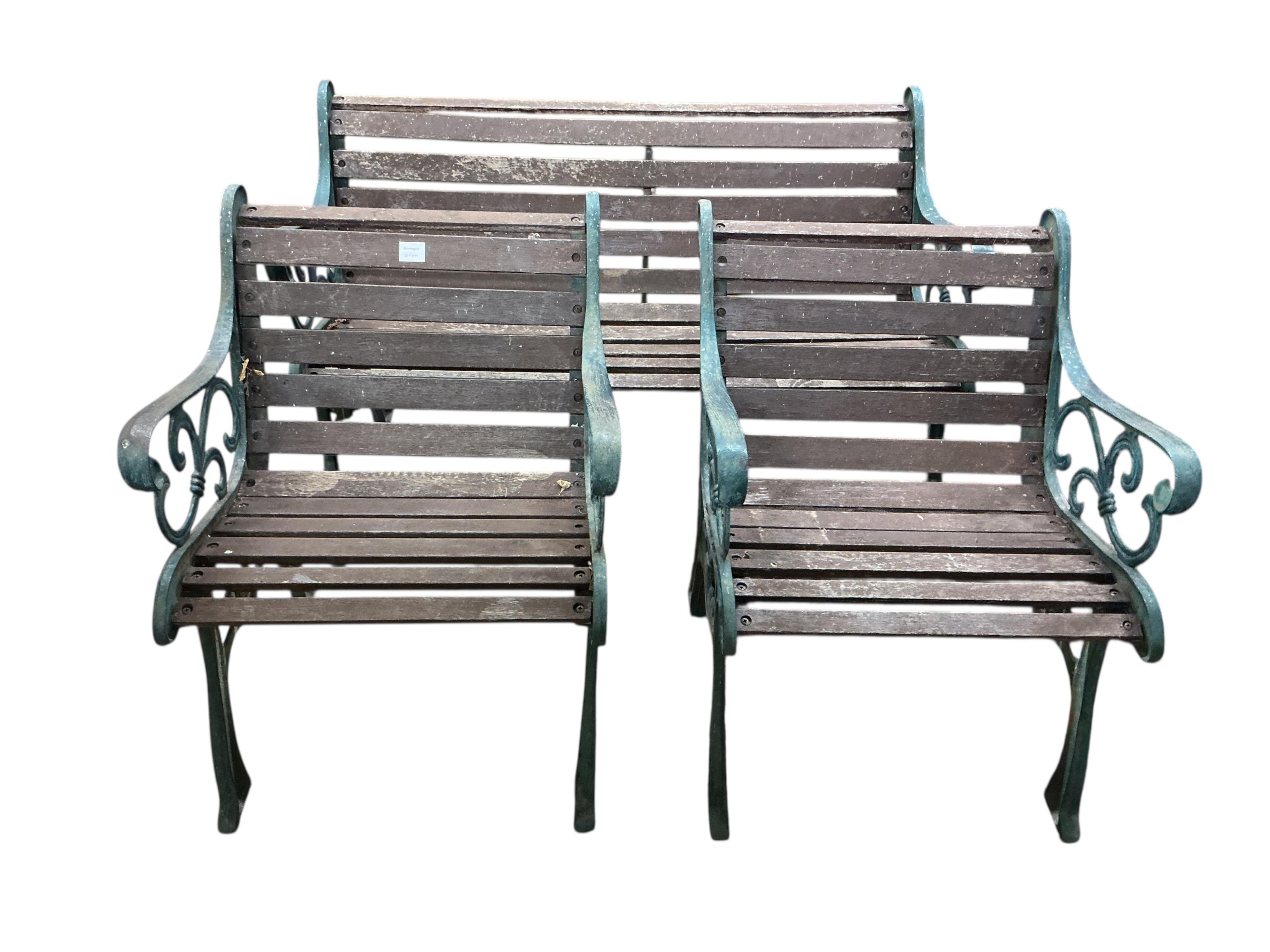 A cast iron and slatted wood garden bench, width 130cm together with two matching chairs