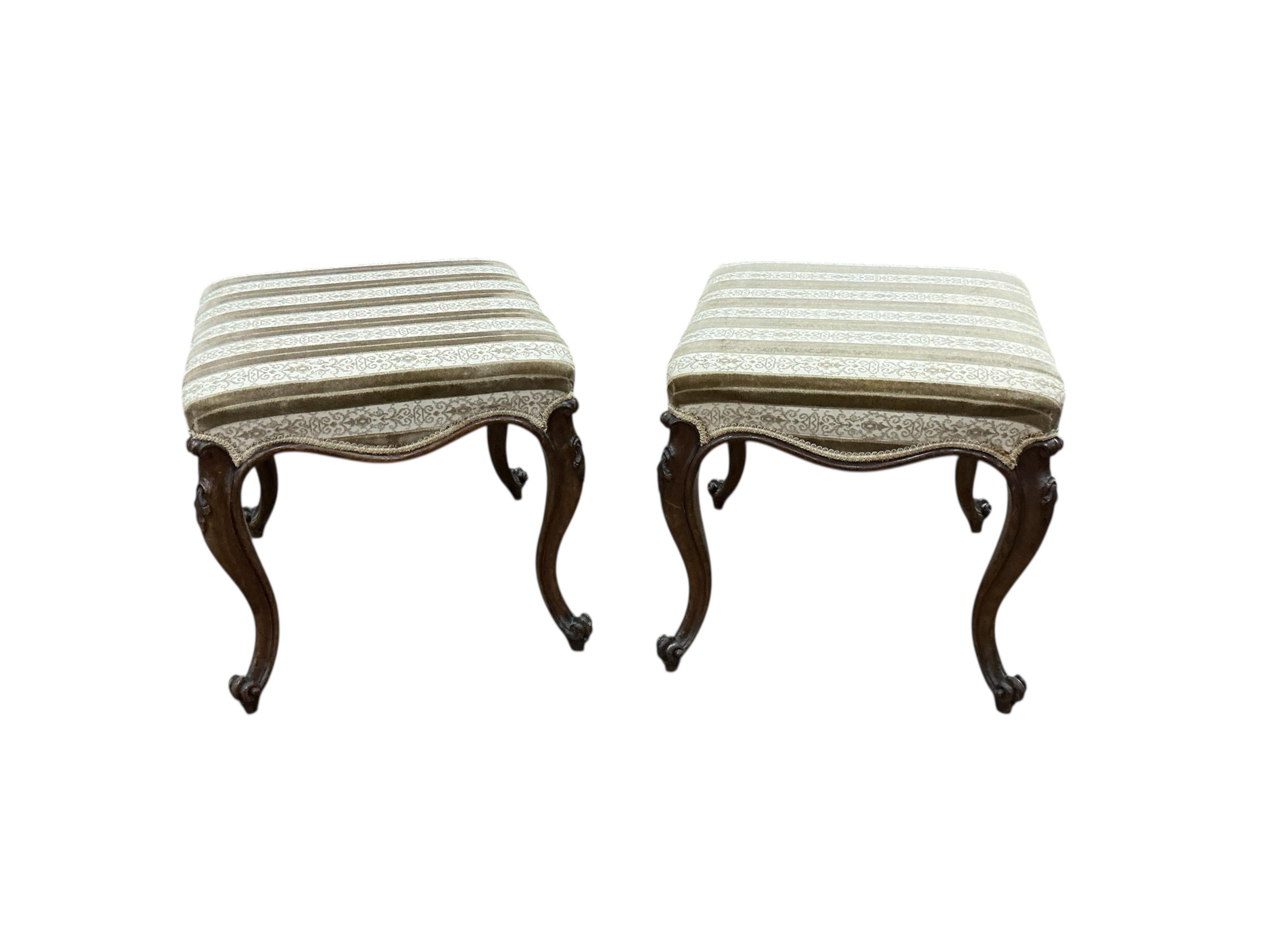 Lot 1412 , A pair of Victorian mahogany stools, stamped Hindley and Son, width 49cm, depth 45cm, height 44cm