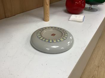 One dish only in this lot, as photographed. Firing crack at inside edge of rim, clearly visible, image 4. Minor surface wear; otherwise good.