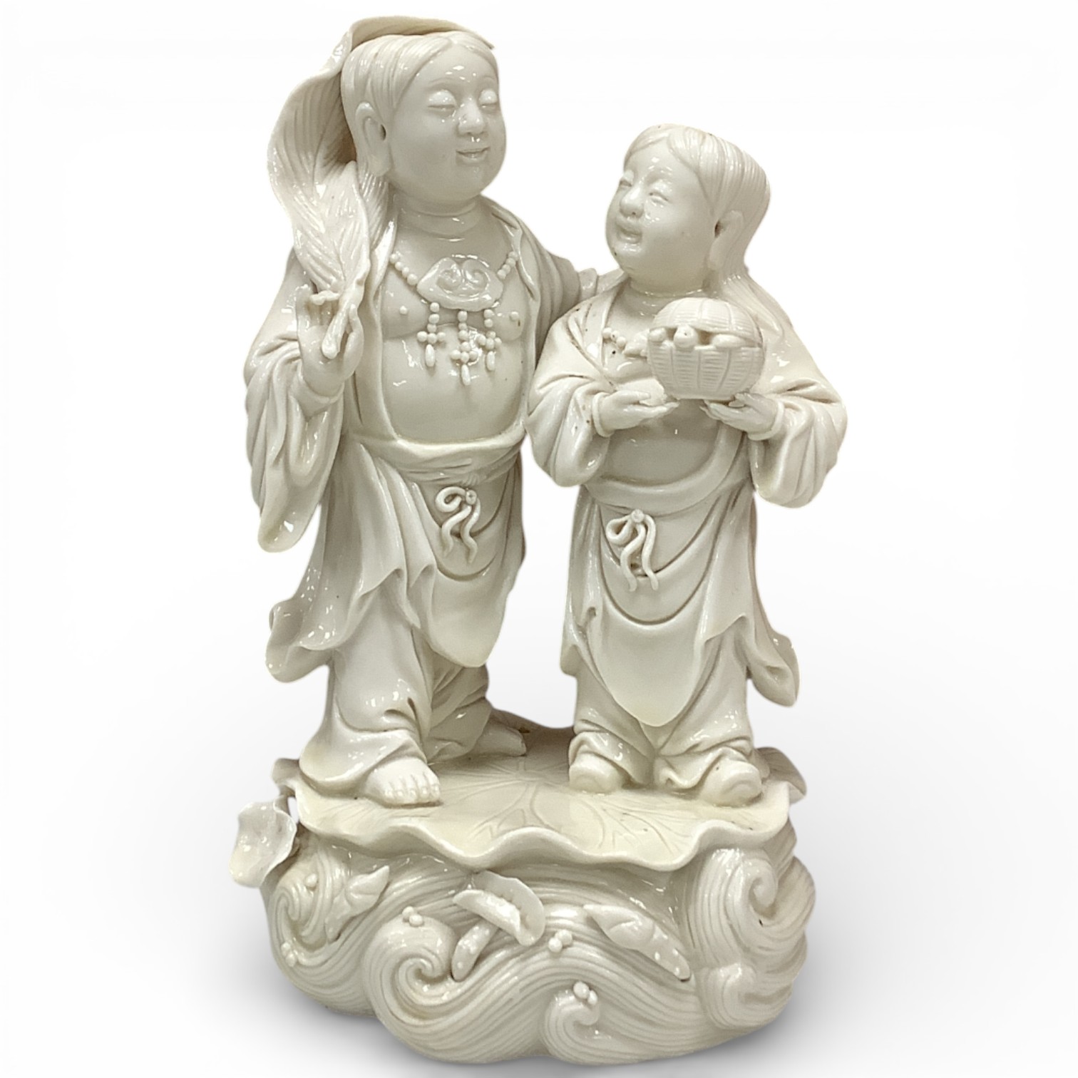 A Chinese blanc de chine group of Hehe Erxian, 24cm high