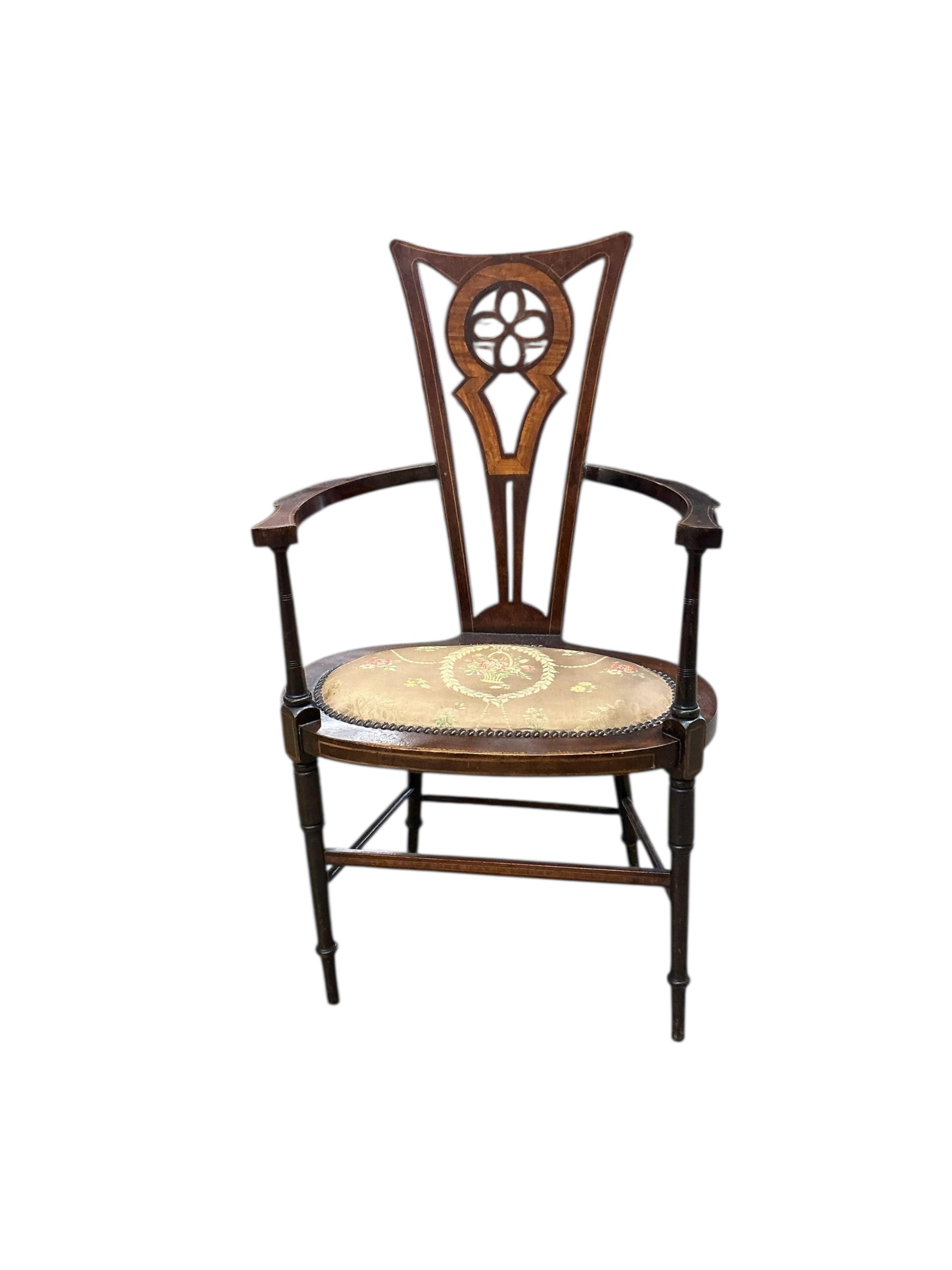 An Edwardian mahogany and satinwood elbow chair, width 55cm, depth 40cm, height 96cm