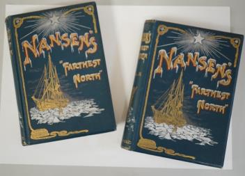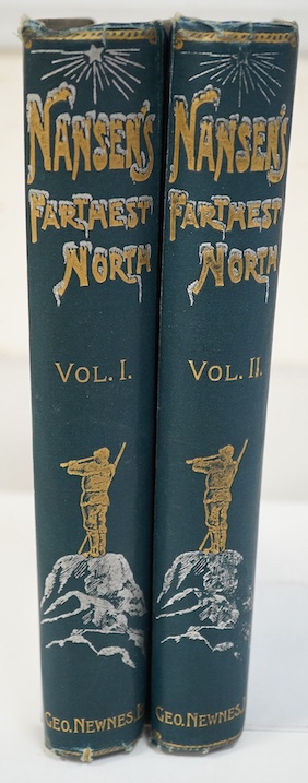 ° Nansen, Fridtjof - "Farthest North": being the record of a voyage of the ship Fram 1893-96 and of a fifteen months' sleigh journey ... 2 vols. a coloured plate and folded map, num. full page and other illus.; original gilt and coloured pictorial cloth, roy.8vo. 1898