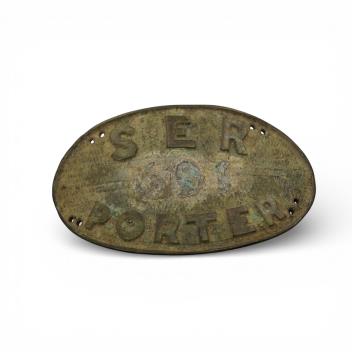 A South Eastern Railway porter’s cast arm badge, together with a BR(E) Notice of Royal Train, Liverpool Street to Wolferton