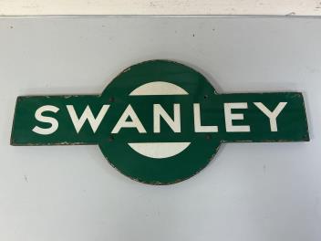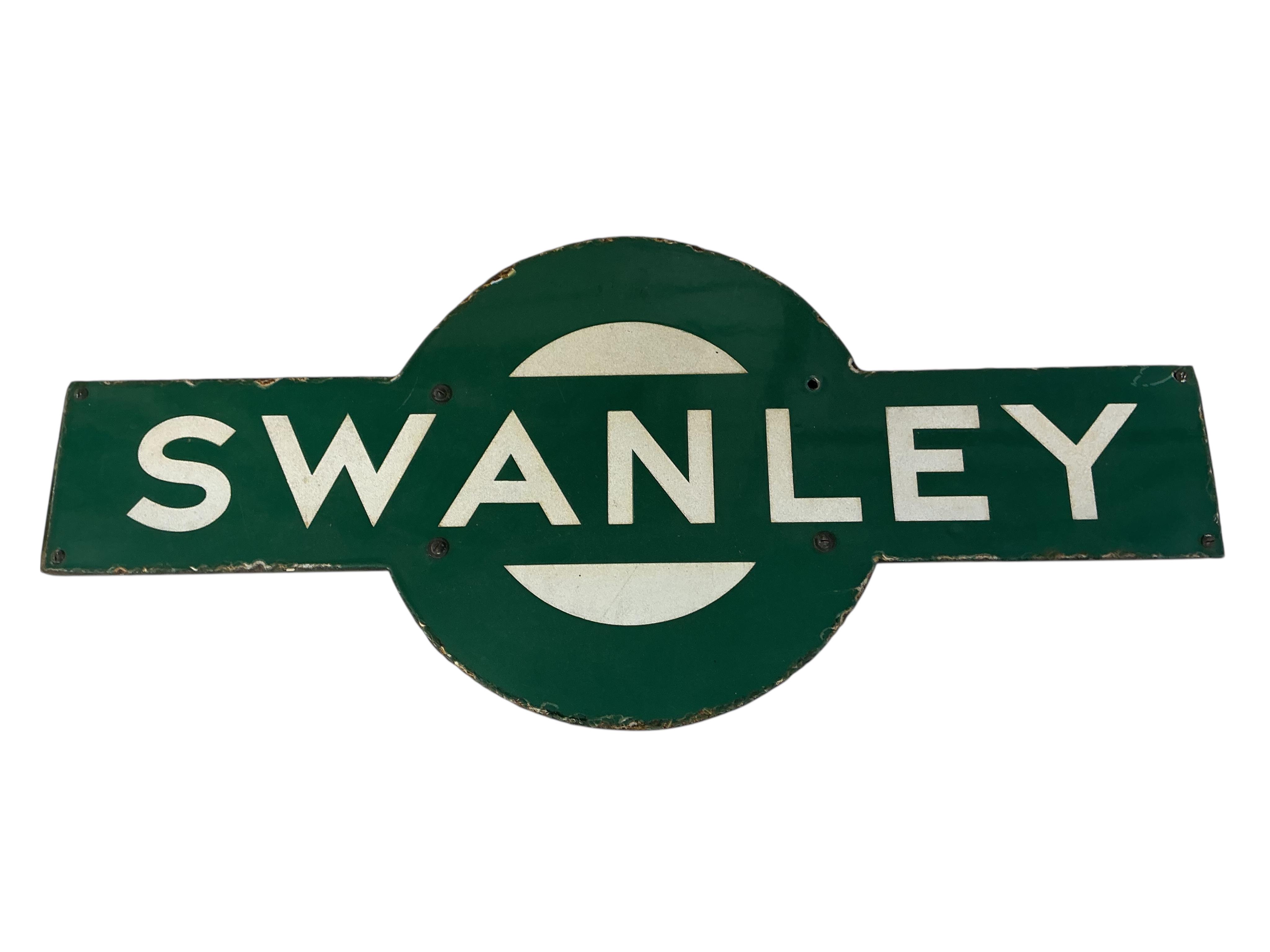 Lot 185 , A Southern Railway enamel platform target sign for SWANLEY, on the ex-SECR Bromley South to Rochester line, mounted to possibly the original wood backing board 74cm wide