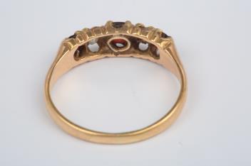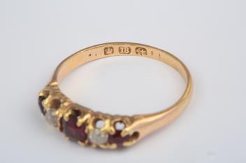 A garnet and diamond five-stone ring, circa 1900, set with an alternating sequence of cushion-shaped garnets and diamonds, mounted in 18ct gold, size N1/2, British hallmarks, gross weight approximately 2.8 grams