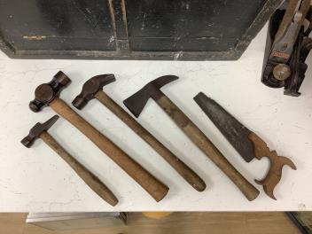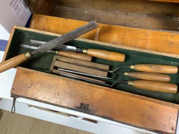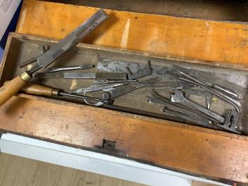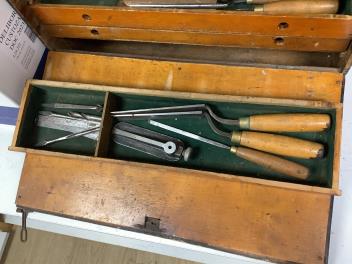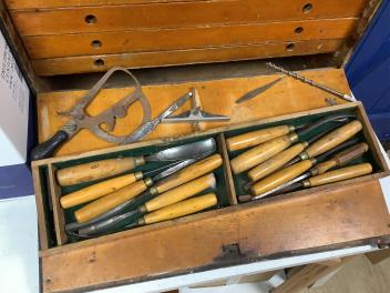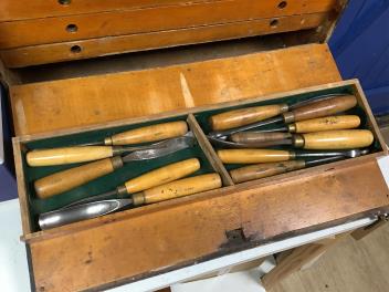 Lot 1082 , An early 20th century cabinet maker’s ebonised chest of tools comprising of seven drawers containing a wide selection of gouges, chisels, drill bits, hammers, a Stanley Bailey No.4 smoothing plane, a Record No.078 double