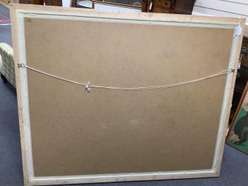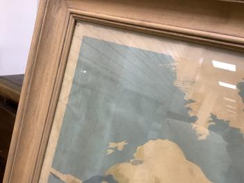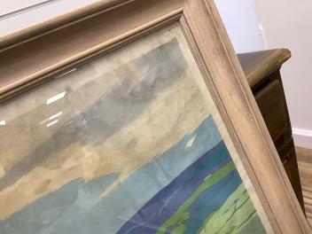 A drawing pin-hole visible at three of the corners; some crumpling/light creases around the sides; patches of discolouration, see further images. Not removed from frame but crumpling suggests not stuck-down.