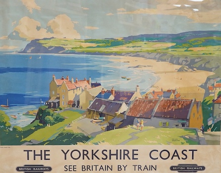 A British Railways original advertising poster, ‘The Yorkshire Coast See Britain By Train’, with artwork by Frank Sherwin of a view of Robin Hood’s Bay, published by Stafford & Co. Ltd., Netherfield, Nottingham, framed and glazed, overall dimensions; 110cm high, 135cm wide