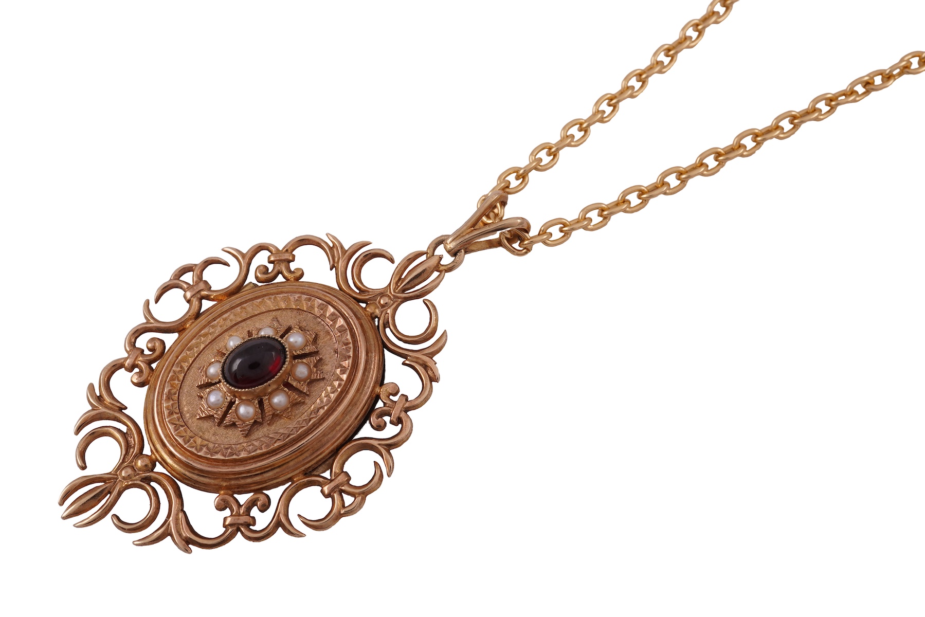 A garnet and seed pearl locket pendant, the oval locket set with a cabochon garnet within a floral border of seed pearls, decorated with engraved designs, to a foliate openwork border, the reverse with a locket compartment, mounted in 9ct gold, length 5.9cm including bail, British hallmarks, gross weight approximately 7 grams, pearls untested