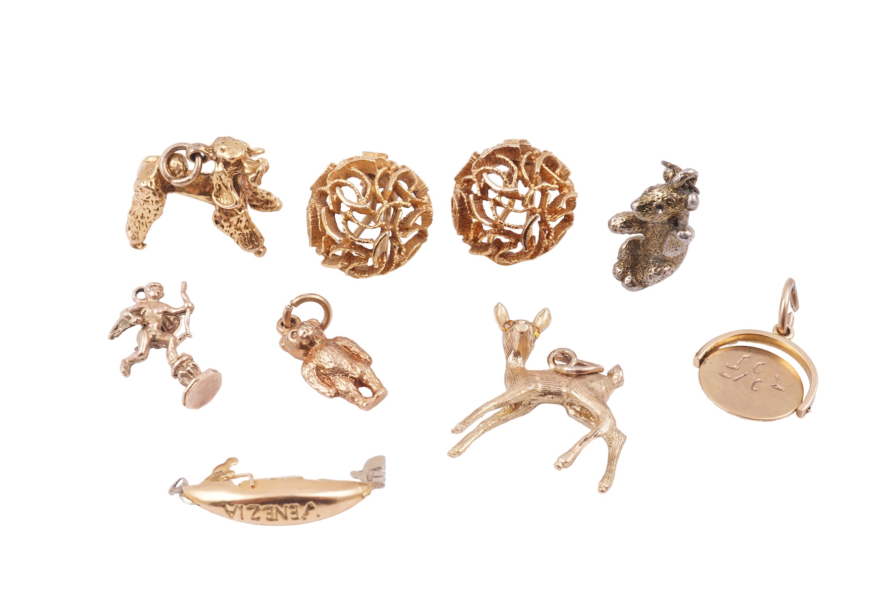 A collection of charms and a pair of ear clips, comprising: four 9ct gold charms designed as a poodle, a spinning disc reading 'I LOVE YOU', a deer and a teddy bear, each with British hallmarks, combined gross weight approximately 13.4 grams; a pair of 9ct gold ear clips of openwork design, length 1.7cm each, British hallmarks, combined gross weight approximately 6.3 grams; a gondola charm, stamped 750, gross weight approximately 0.7 grams; and two unmarked charms designed as the statue of Eros in Piccadilly Circus, and a bear cub, combined gross weight approximately 5 grams