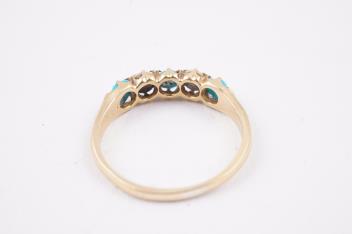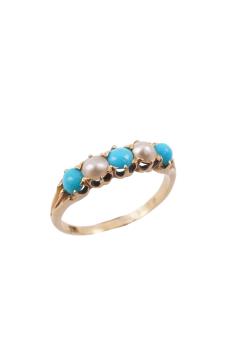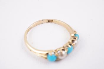 A turquoise and split pearl ring, circa 1900, set with alternating turquoise cabochons and split pearls, mounted in gold, size O, sponsor's mark GI, gross weight approximately 2.5 grams