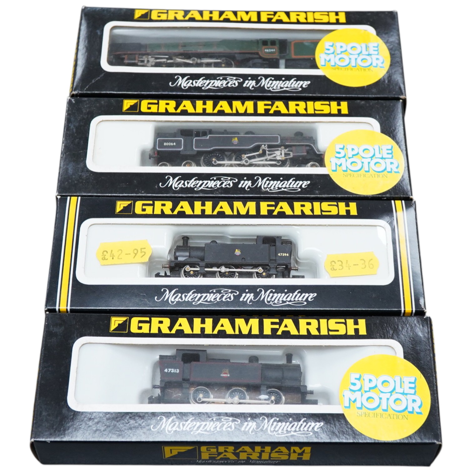 Four boxed Graham Farish N gauge railway BR locomotives; a Coronation class, King George VI 46244 (1814), a class 4MT, 80064 (1655), class 3F, 47394 (1735), and an 0-6-0T, 47313 (1705)
