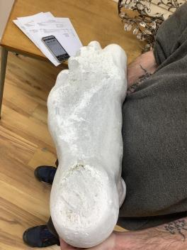 A cast composition portrait bust of a youth, a large plaster foot, and a cast ceramic portrait roundel, bust 56cm.