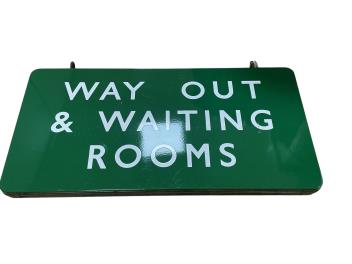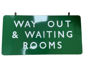 Lot 177 , A double sided hanging BR(S) enamel railway sign; WAY OUT & WAITING ROOMS, comprising of two separate panels screwed to a frame with a lead seam in between, with the two original hanging loops, 91cm wide, 46cm high, 5cm