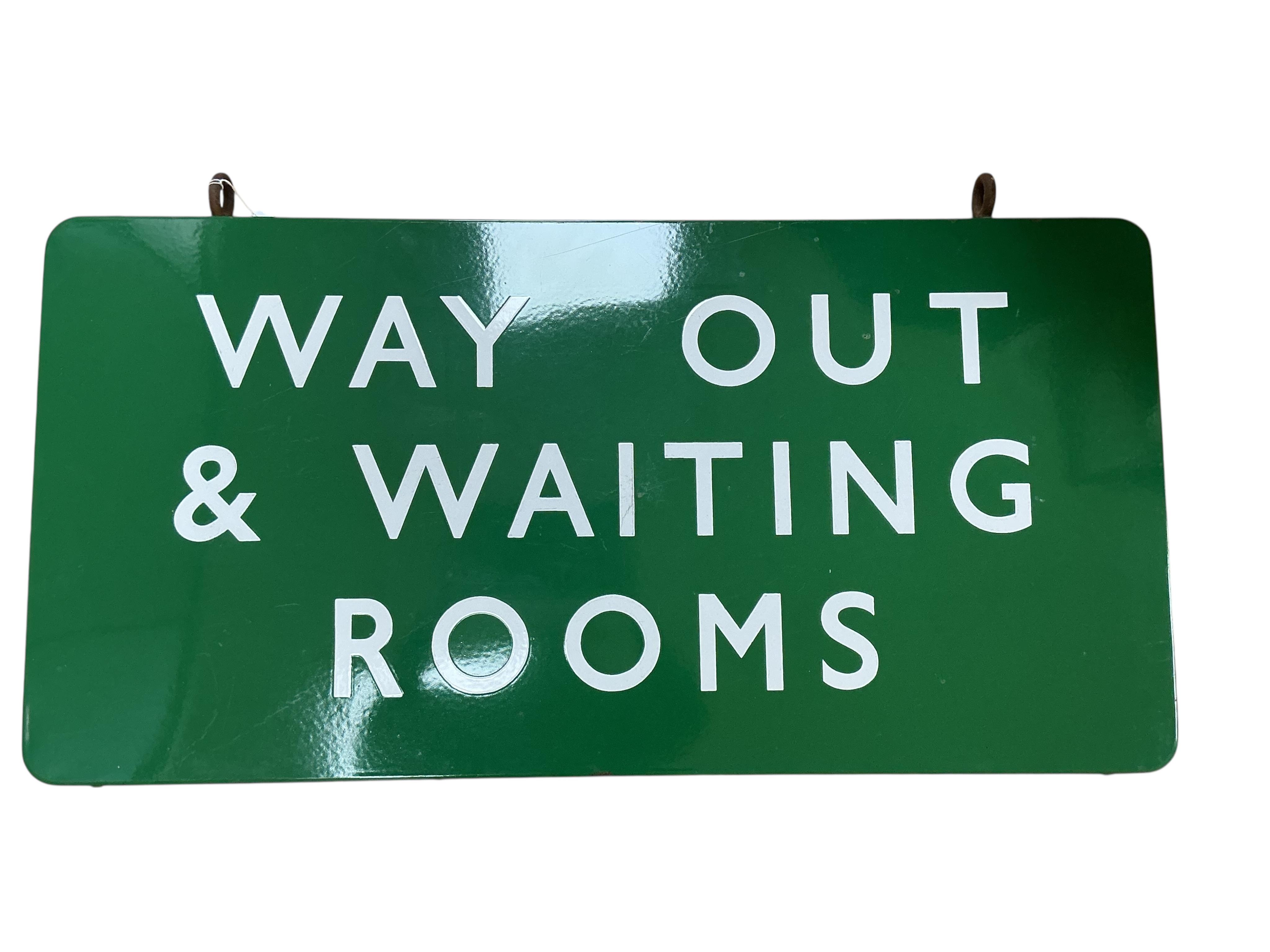 A double sided hanging BR(S) enamel railway sign; WAY OUT & WAITING ROOMS, comprising of two separate panels screwed to a frame with a lead seam in between, with the two original hanging loops, 91cm wide, 46cm high, 5cm deep