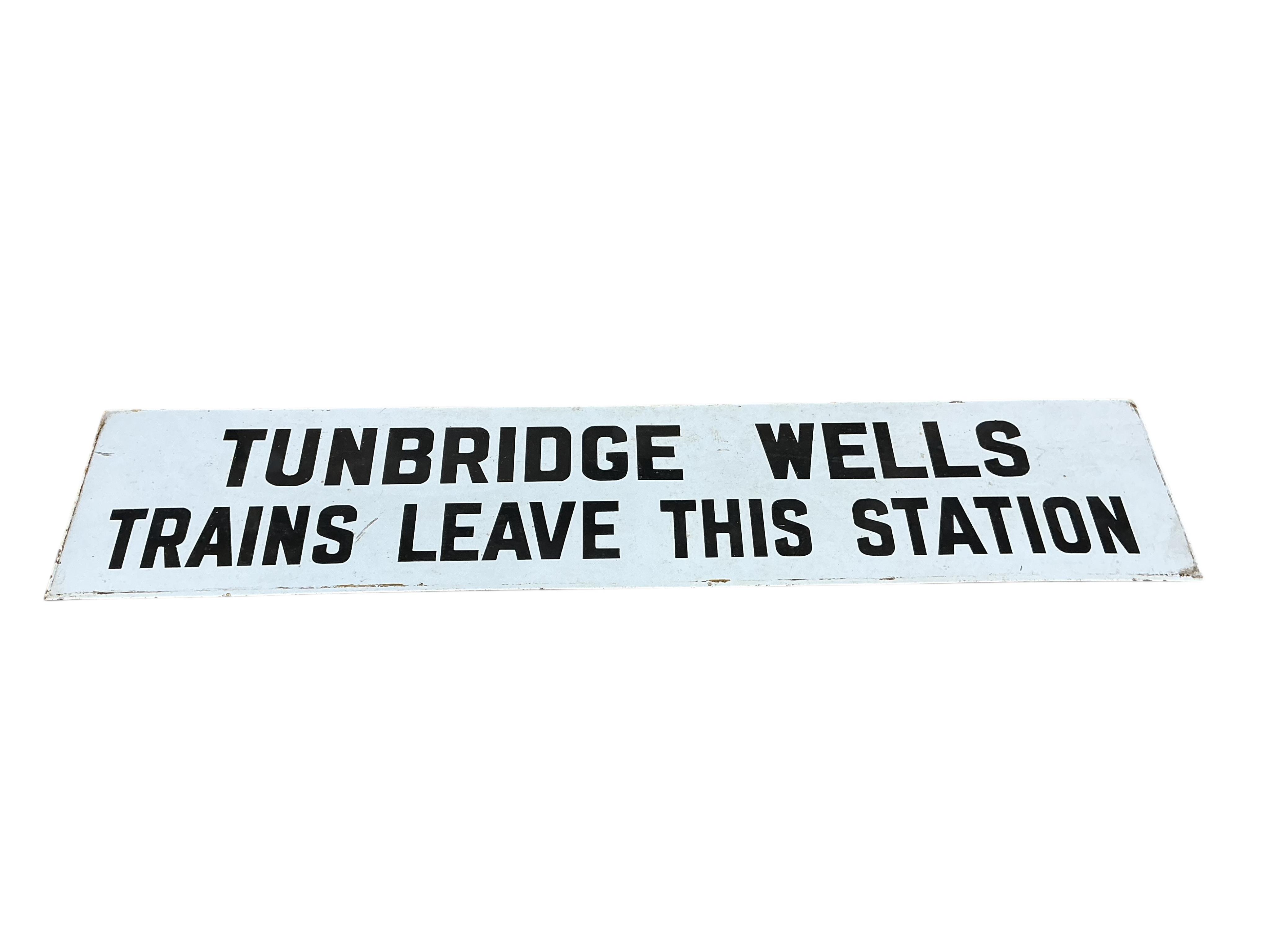 Lot 169 , A BR(S) enamel railway sign; TUNBRIDGE WELLS TRAINS LEAVE THIS STATION, black lettering on a white ground, 116cm wide, 24cm high