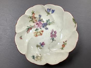 Lot 258 , Three Bow polychrome coffee cups, a Chelsea Red Anchor saucer, and a Chelsea Gold Anchor coffee cup painted with birds, saucer 12cm