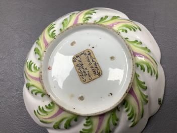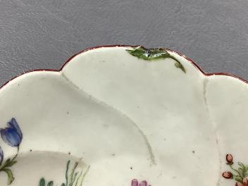 One Bow cup lower handle joint cracked full-circle, image 4; otherwise good. Other two cups structurally good; all three with some wear to enamels. Gold Anchor cup structurally good; gilded neckrim with rubs and wear; gilding at handle worn; pine-cone moulding. Saucer with hairline cracks at centre inward from rim, approx. 7mm, visible inside and out; some wear to interior caused by stacking; red enamel to rim worn. “Chelsea Moons” visible; green leaf painted at rim is a manufacturing characteristic disguising a blemish/chip, image 5.