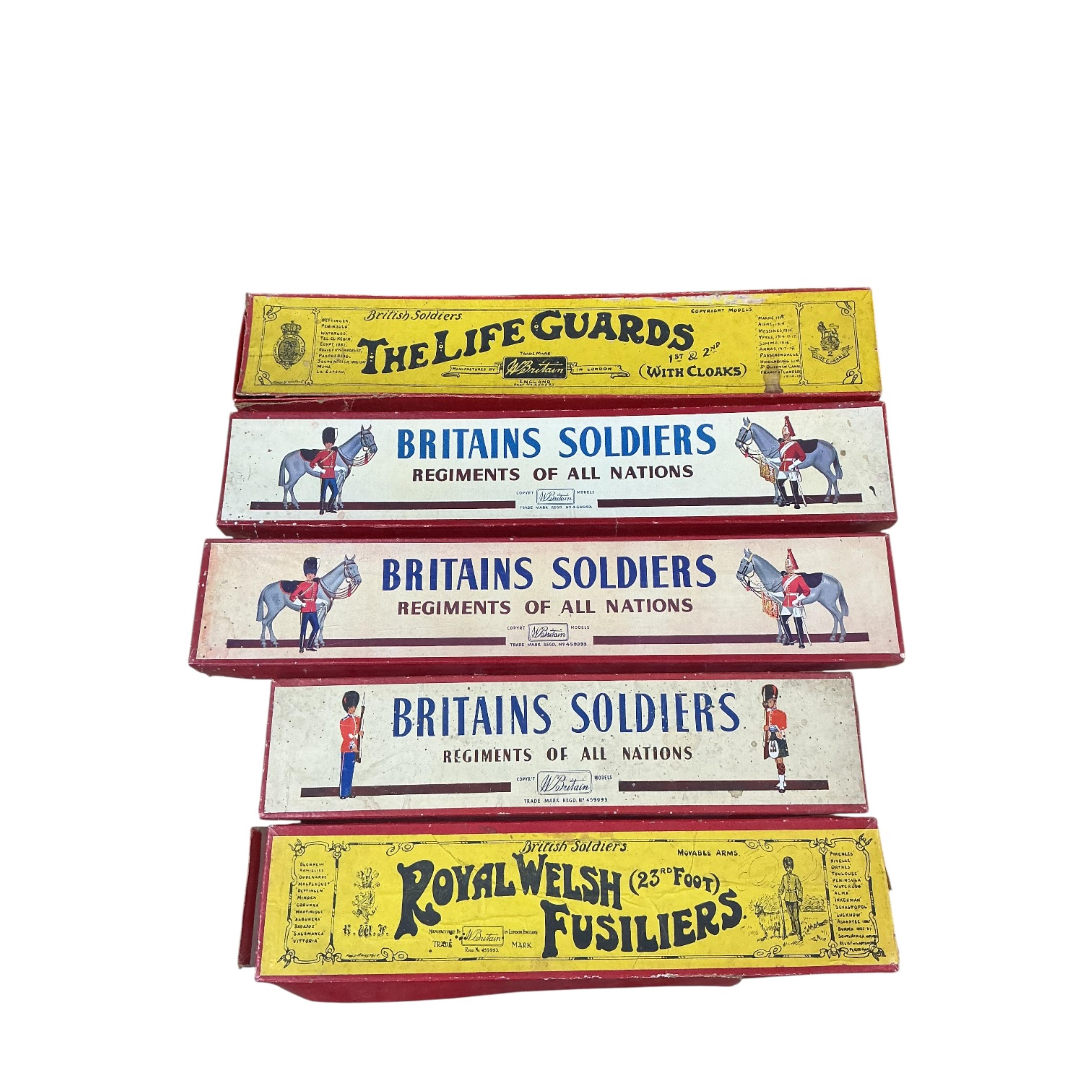 Lot 111 , Five boxed partial sets of Britains lead soldiers; ‘British Soldiers’; Royal Welsh Fusiliers (No.74) (6 figures), The Life Guards with cloaks (2 figures) (No.400), and three ROAN boxed sets; Skinner’s Horse (4 figures) (