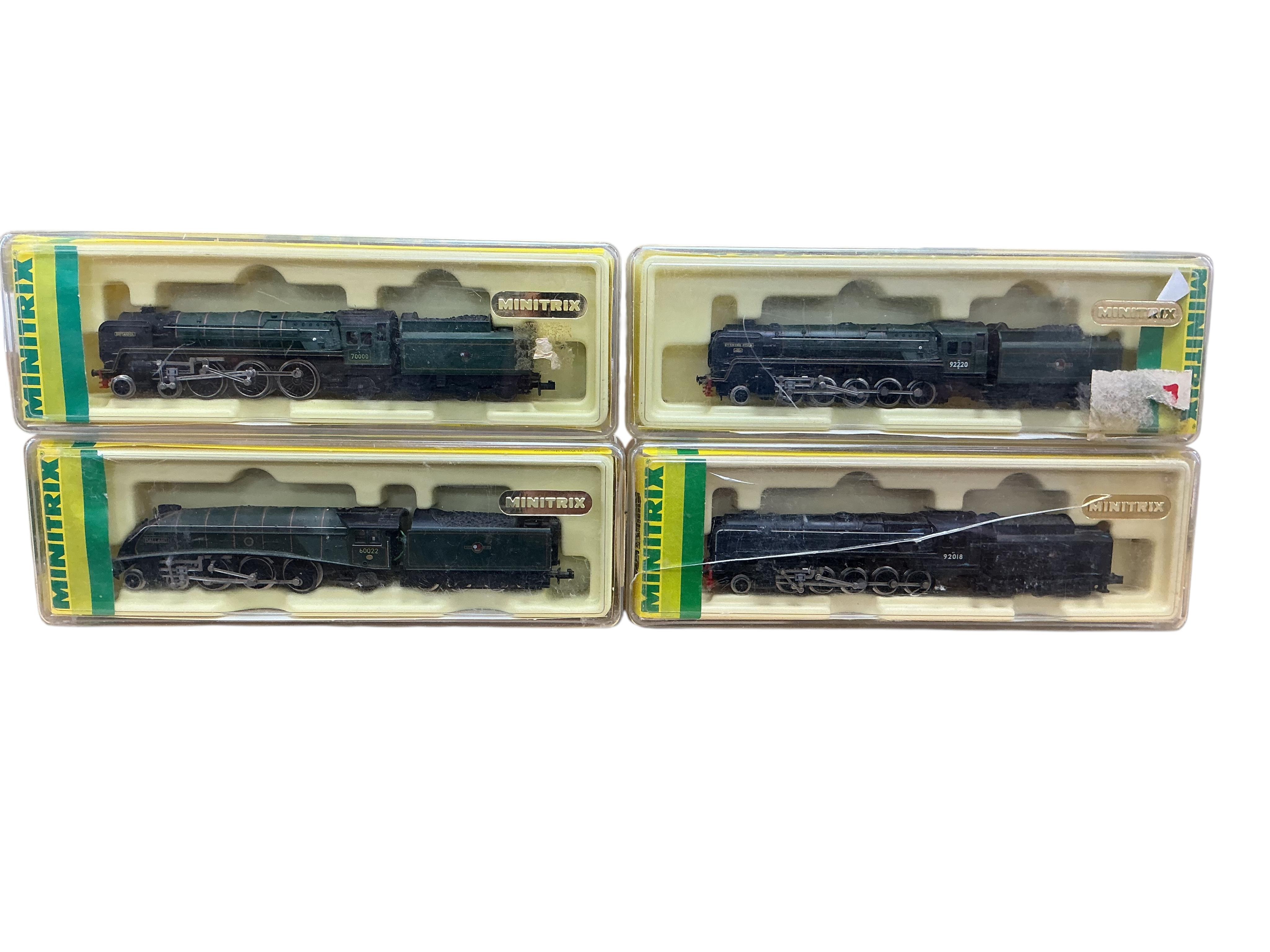 Lot 14 , Four boxed Minitrix N gauge railway BR tender locomotives; a Britannia class, Britannia 70000 (12042), a class A4, Mallard 60022 (12947), and two class 9F, Evening Star 92220 (12041), and 92018 (12058)
