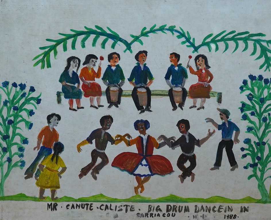 Lot 3313 , Canute Caliste (1914-2005), ‘Big Drum Dancing, Carriacou’, signed, inscribed and dated 1988, naive oil on board, 30 x 38cm