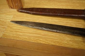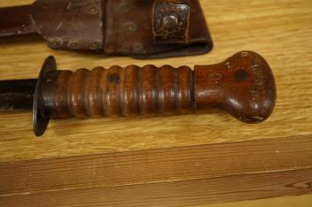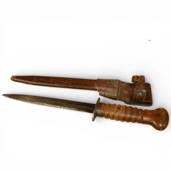 Lot 17 , An early 20th century Dutch fighting knife, ‘Stormdolk’ M1917, with straight double edged blade, oval steel crossguard, wooden grip and leather scabbard with belt loop, ‘1553D’ stamped to both the crossguard and the scab