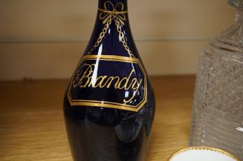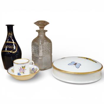 Lot 322 , An early 19th century Brandy decanter, a cut glass decanter and stopper, Sevres coffee can and saucer and a Limoges covered dish, latter 21cm