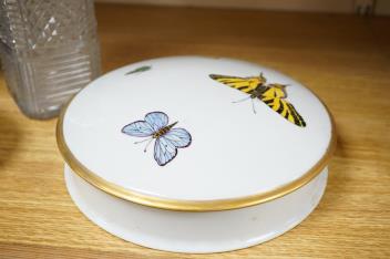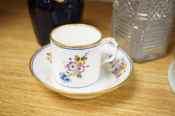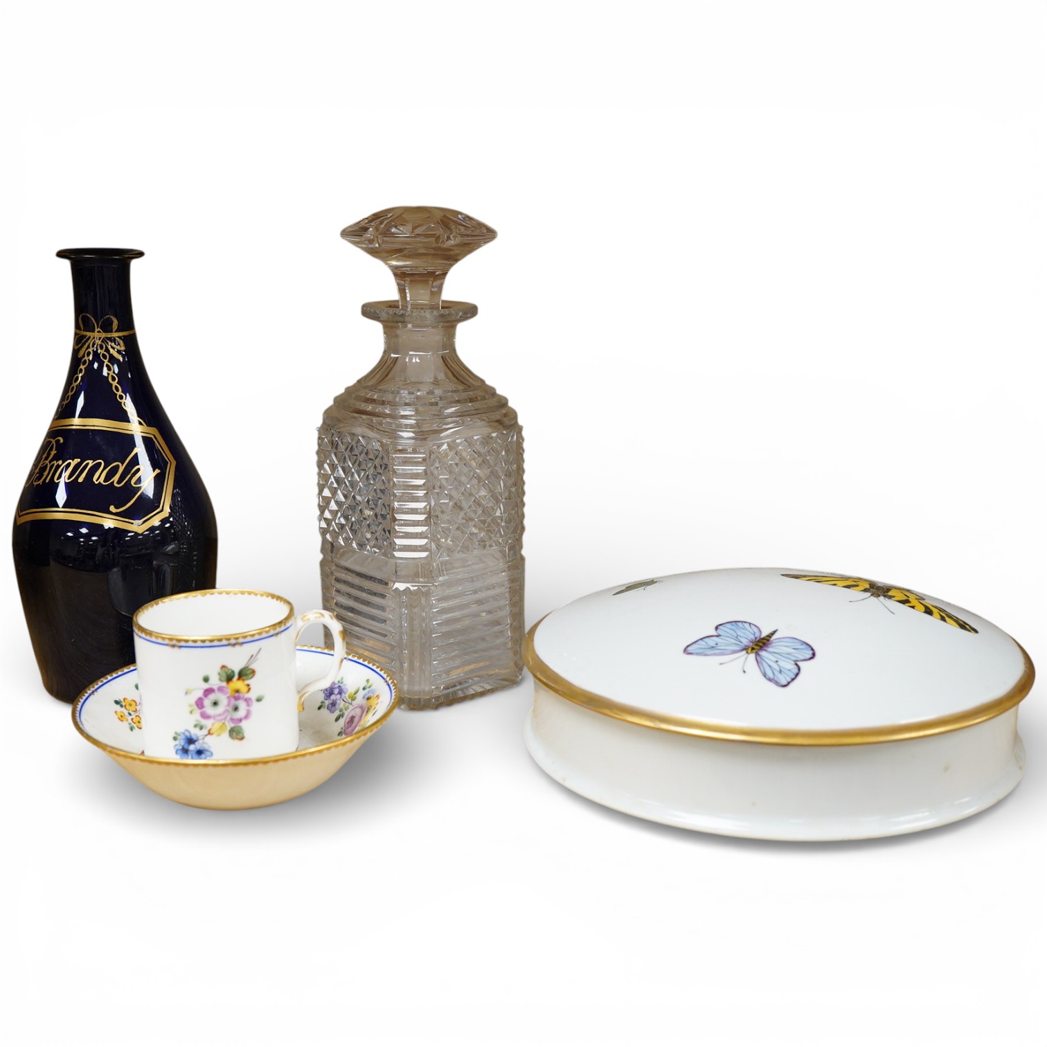 An early 19th century Brandy decanter, a cut glass decanter and stopper, Sevres coffee can and saucer and a Limoges covered dish, latter 21cm