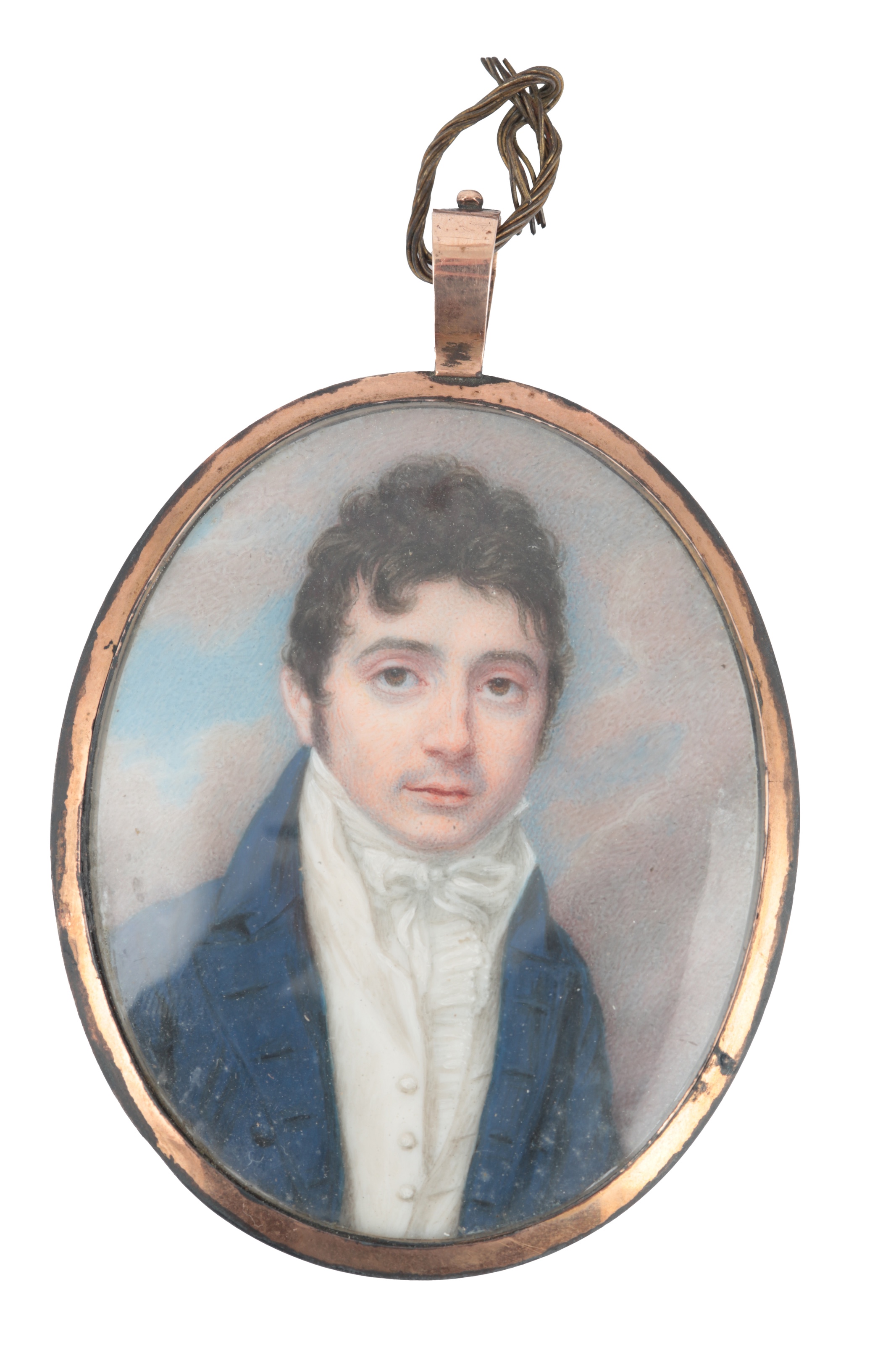 A portrait miniature of a gentleman wearing a cravat and frock coat, before cloudy skies,