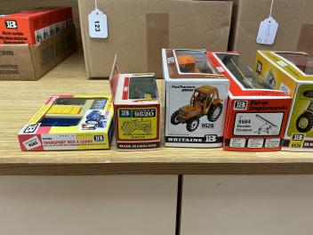 Lot 121 , Six 1970s Britains Farm Models; a FIAT tractor (9528), a Ford 6600 tractor (9524), a Massey Ferguson 135 tractor (9520), a bale sledge (9557), an elevator (9564), and a transport box and loads pack (9545)