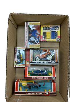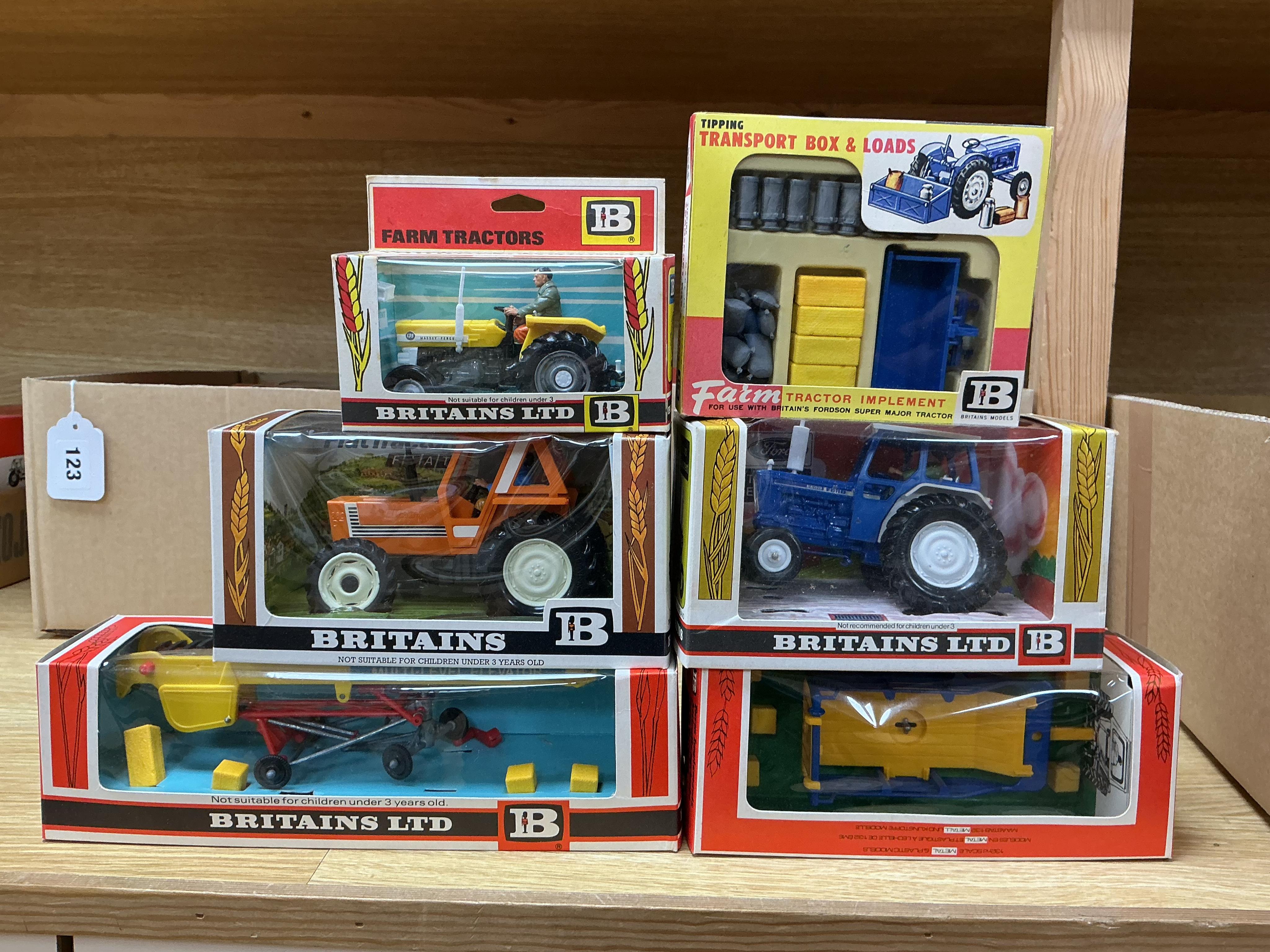Six 1970s Britains Farm Models; a FIAT tractor (9528), a Ford 6600 tractor (9524), a Massey Ferguson 135 tractor (9520), a bale sledge (9557), an elevator (9564), and a transport box and loads pack (9545)