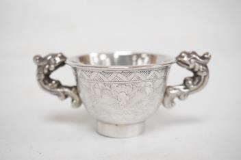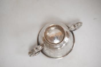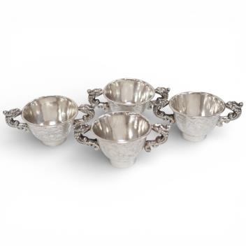Lot 1021 , A set of four early 20th century Chinese white metal two handled tots, engraved with foliage, height 32mm, signed on the base.