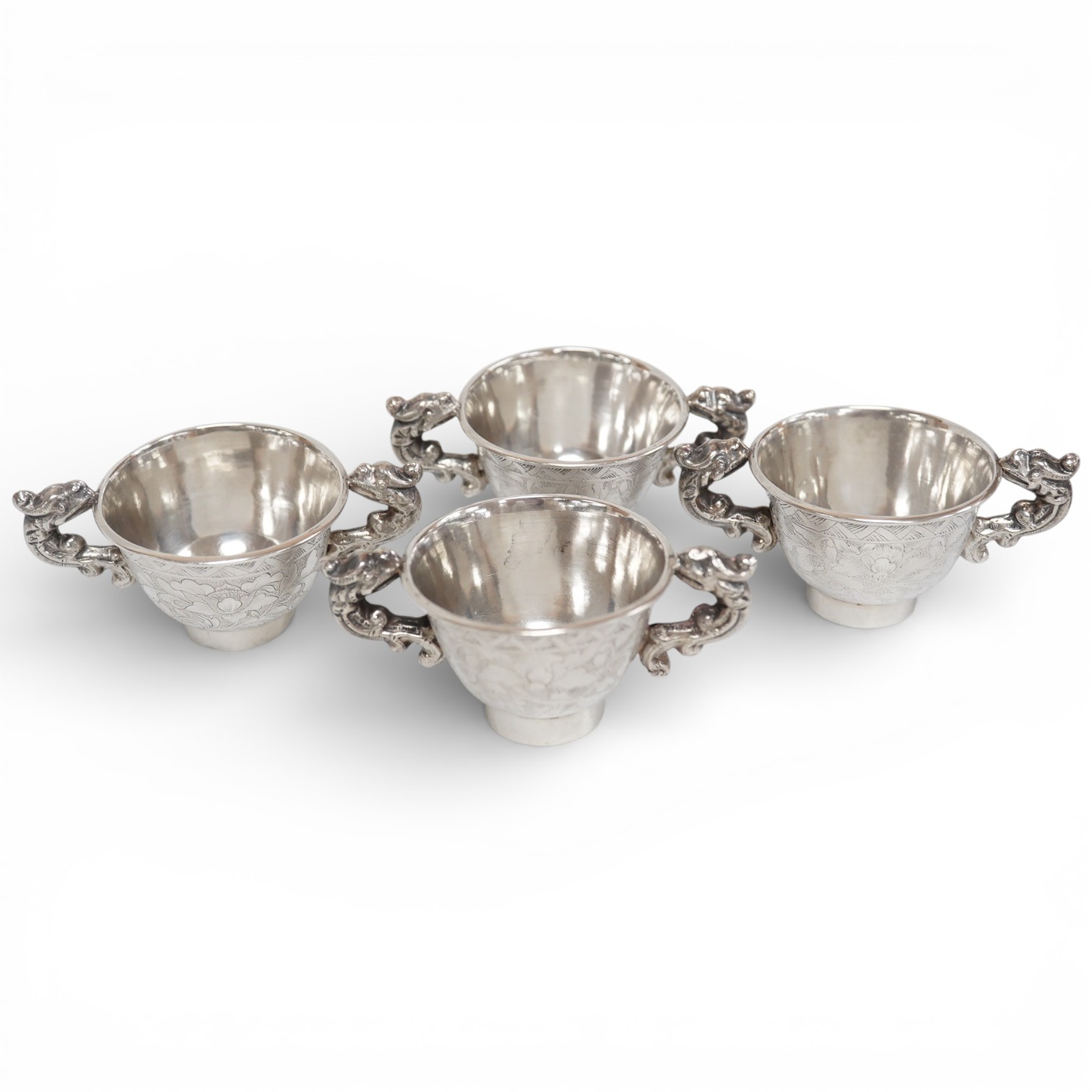 A set of four early 20th century Chinese white metal two handled tots, engraved with foliage, height 32mm, signed on the base.
