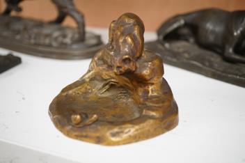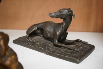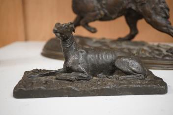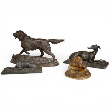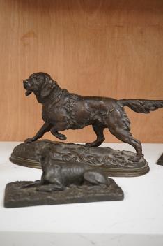 Lot 1401 , After Paul-Édouard Delabrièrre, a bronze study of a gun dog, signed, together with two spelter recumbent greyhounds and a bronze after Louis-Albert Carvin, largest 25cm wide
