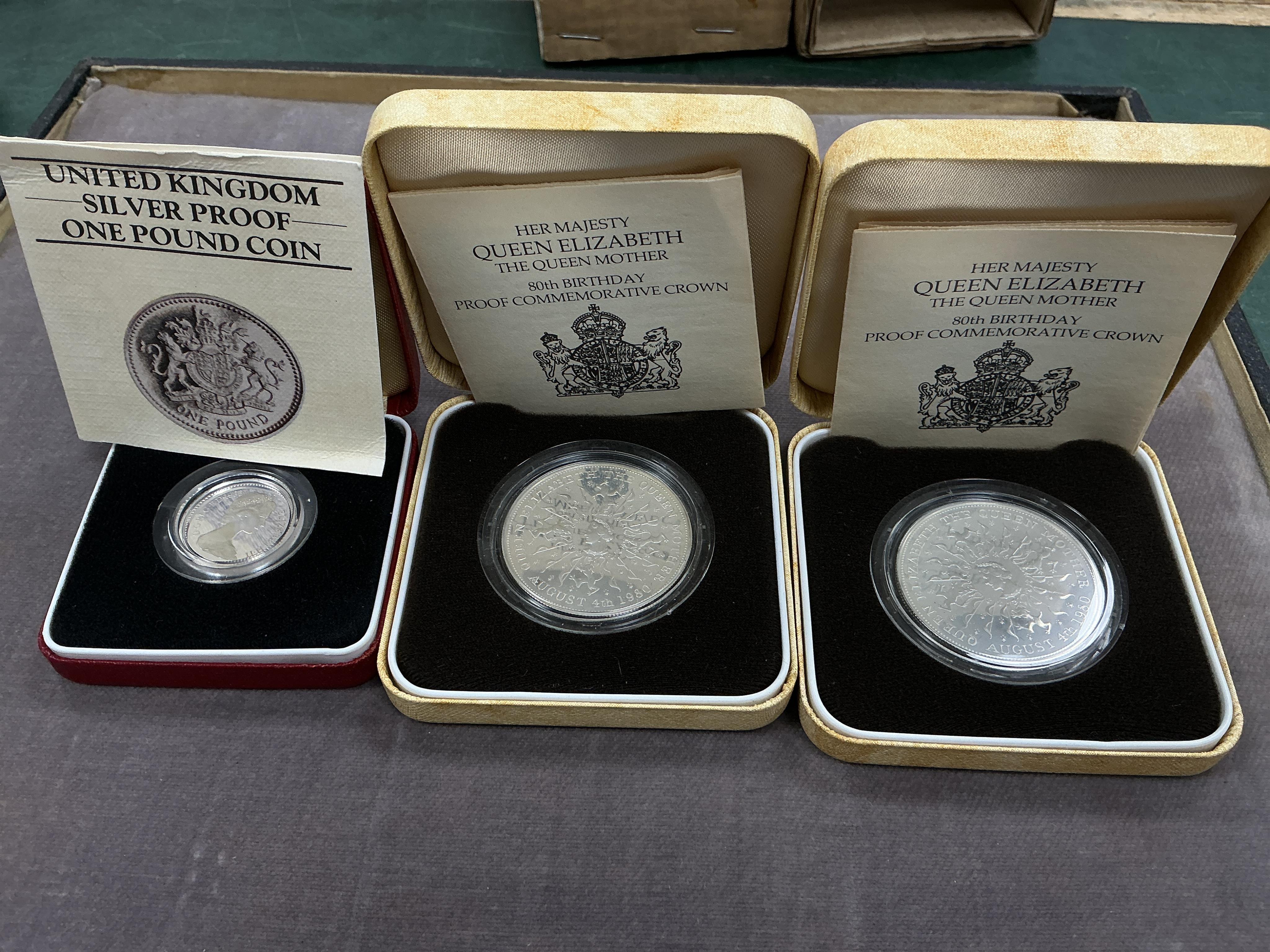 British proof silver coins, Elizabeth II, Queen Mother 80th birthday crowns, together with £1 coin, cased