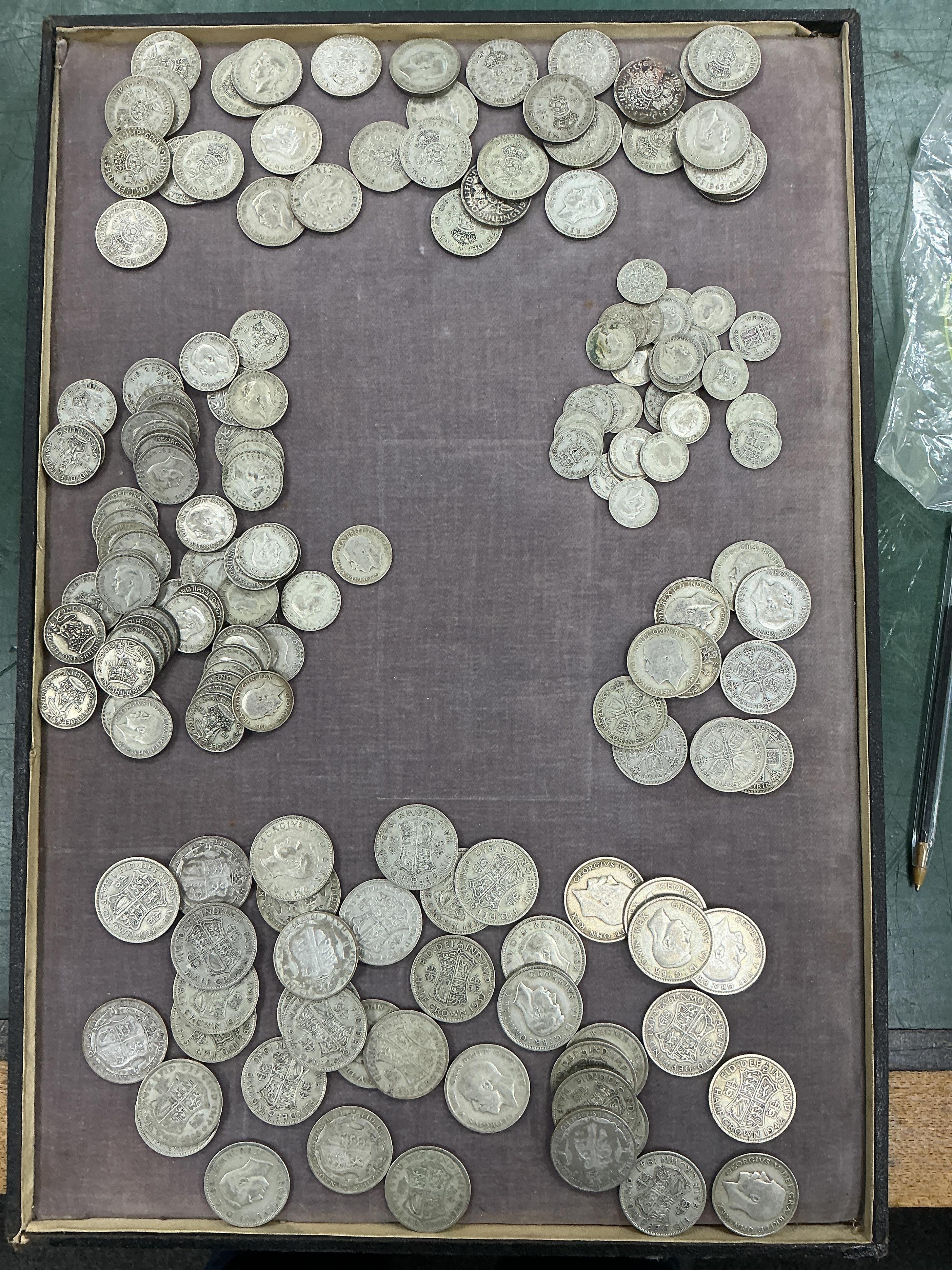 Lot 2066 , British silver coins, a large group of George V to George VI silver coins, 1920-46, comprising 40 half crowns, 10 Florins, 34 two shillings, 61 shillings, 35 sixpences and seven other coins