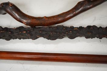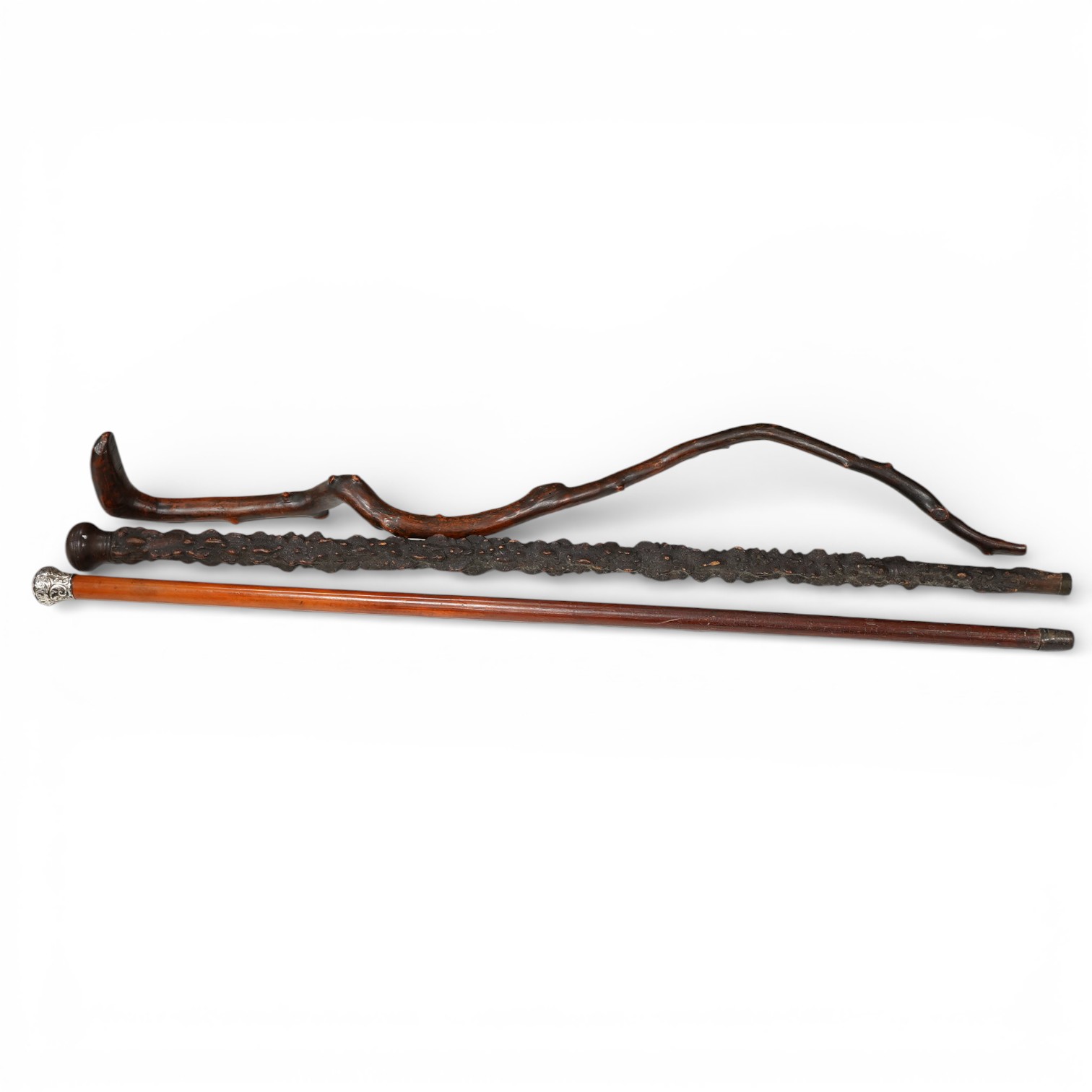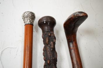 Lot 1437 , A collection of three 19th century walking sticks comprising a silver topped example and two hedgerow examples